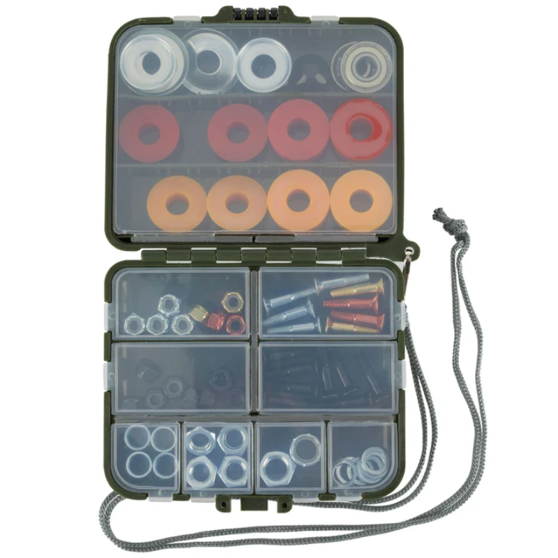 Caja de repuestos marca independent ideal para mantener en tu mochila y solucionar problemas técnicos al patinar. Rodamientos, gomas de diferentes durezas, pernos, tuercas y más.